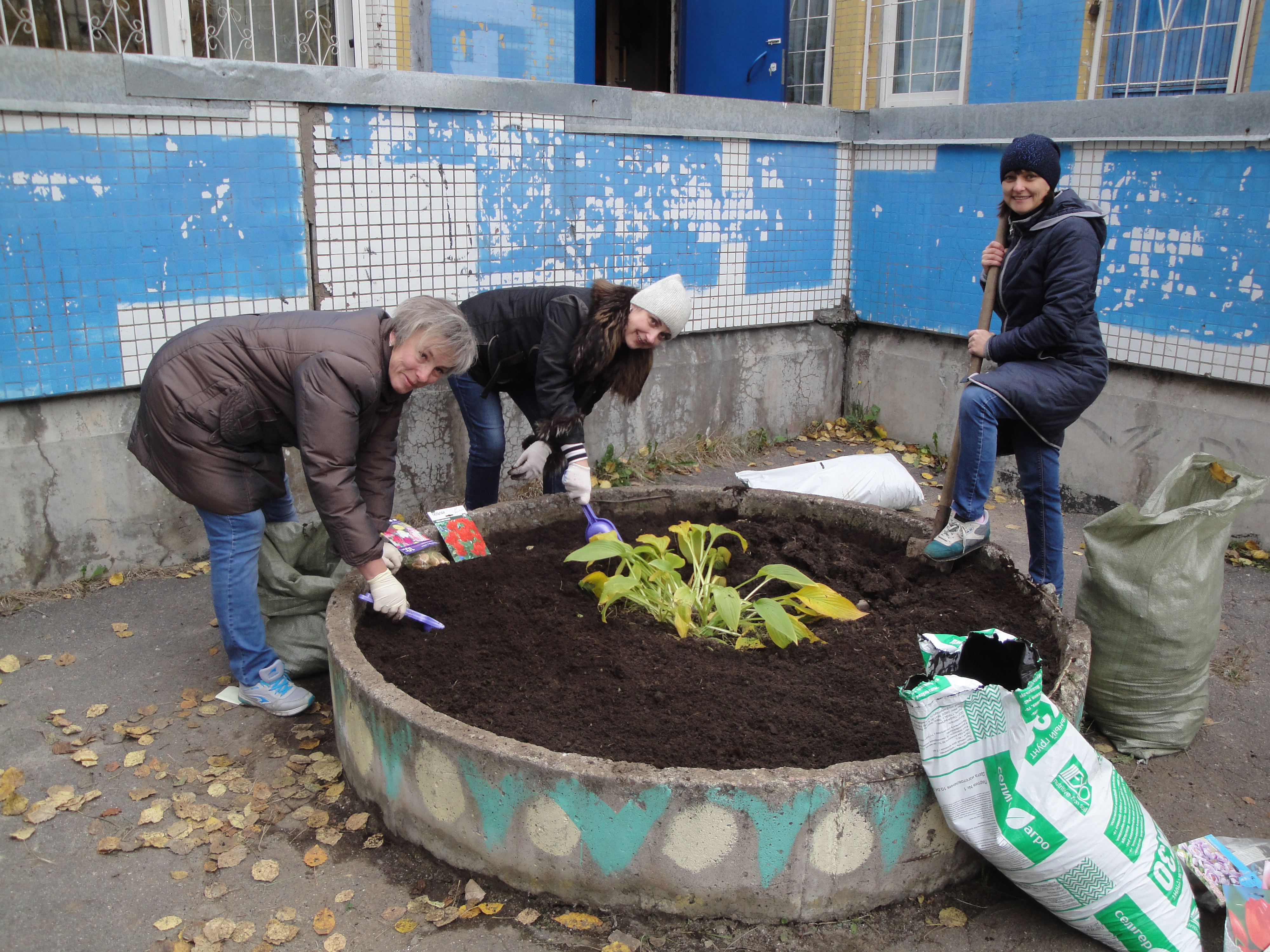 мы высадили деревья и кустарники, которые получили взамен на макулатуру. Посадили в клумбы цветы, от нашей акции.